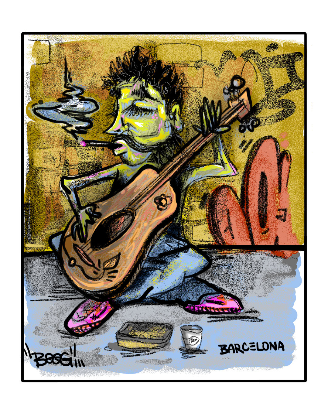 3.6x4.5 mini digital download of a gritty, expressive street scene capturing a lone guitarist mid-performance. The figure, loosely sketched with bold, textured strokes, smokes a cigarette while strumming an acoustic guitar, set against a raw, graffiti-like backdrop. Muted yellows and rough linework give the piece an urban, late-night energy, while small details—a tip container and cup at his feet—add a sense of realism. The composition feels both rough and soulful, echoing the spirit of street music and city life.